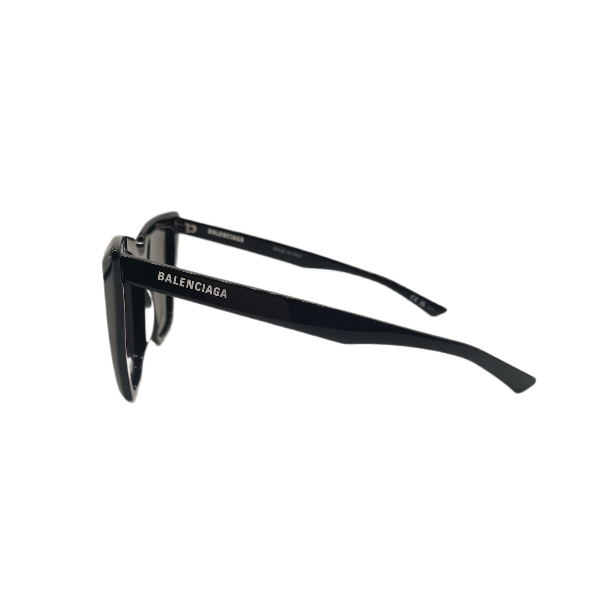 Classica montatura in acetato, rivisitata con bordi a punta esagerati, ottenuti tramite fresatura tridimensionale. Logo Balenciaga a contrasto sull’asta sinistra. Lenti infrangibili tinta unita.
