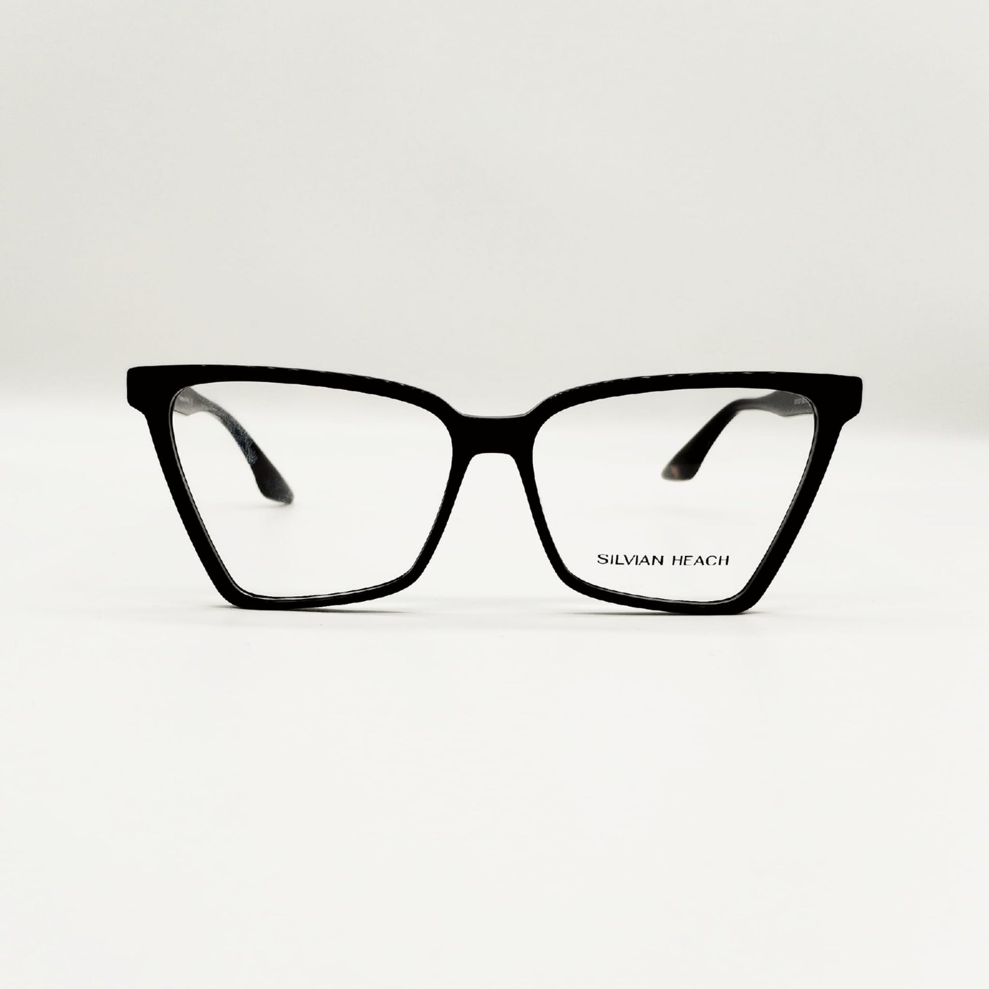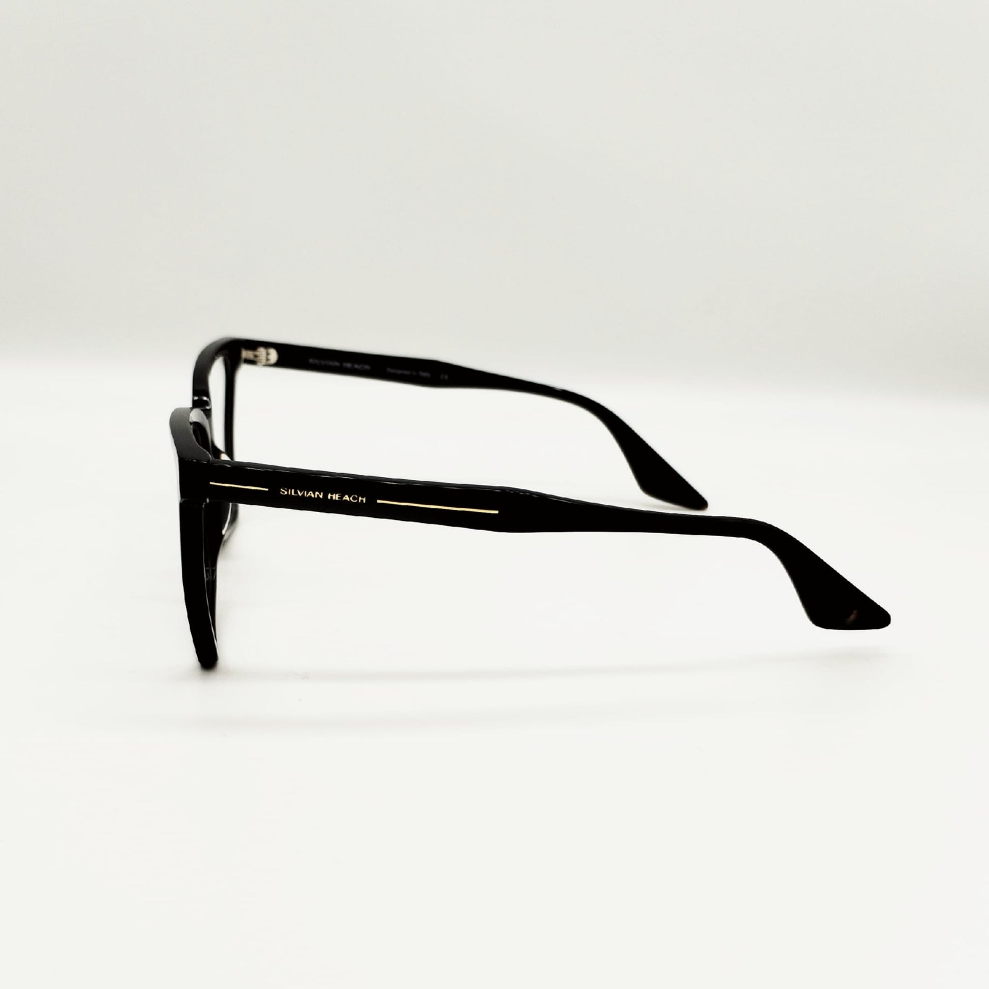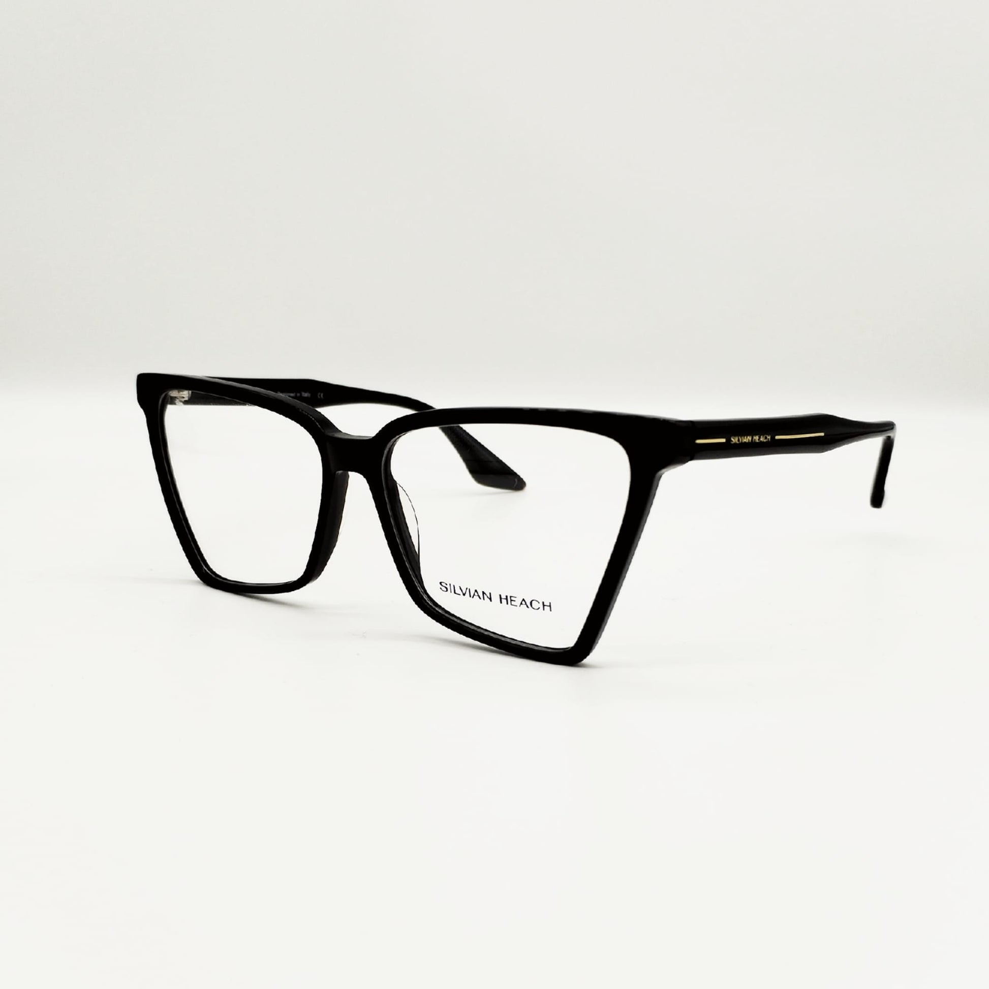 Montatura dalla forma geometrica e sottile, con un tocco all’insù per conferire femminilità. Colore nero lucido con scritta oro sulle aste.