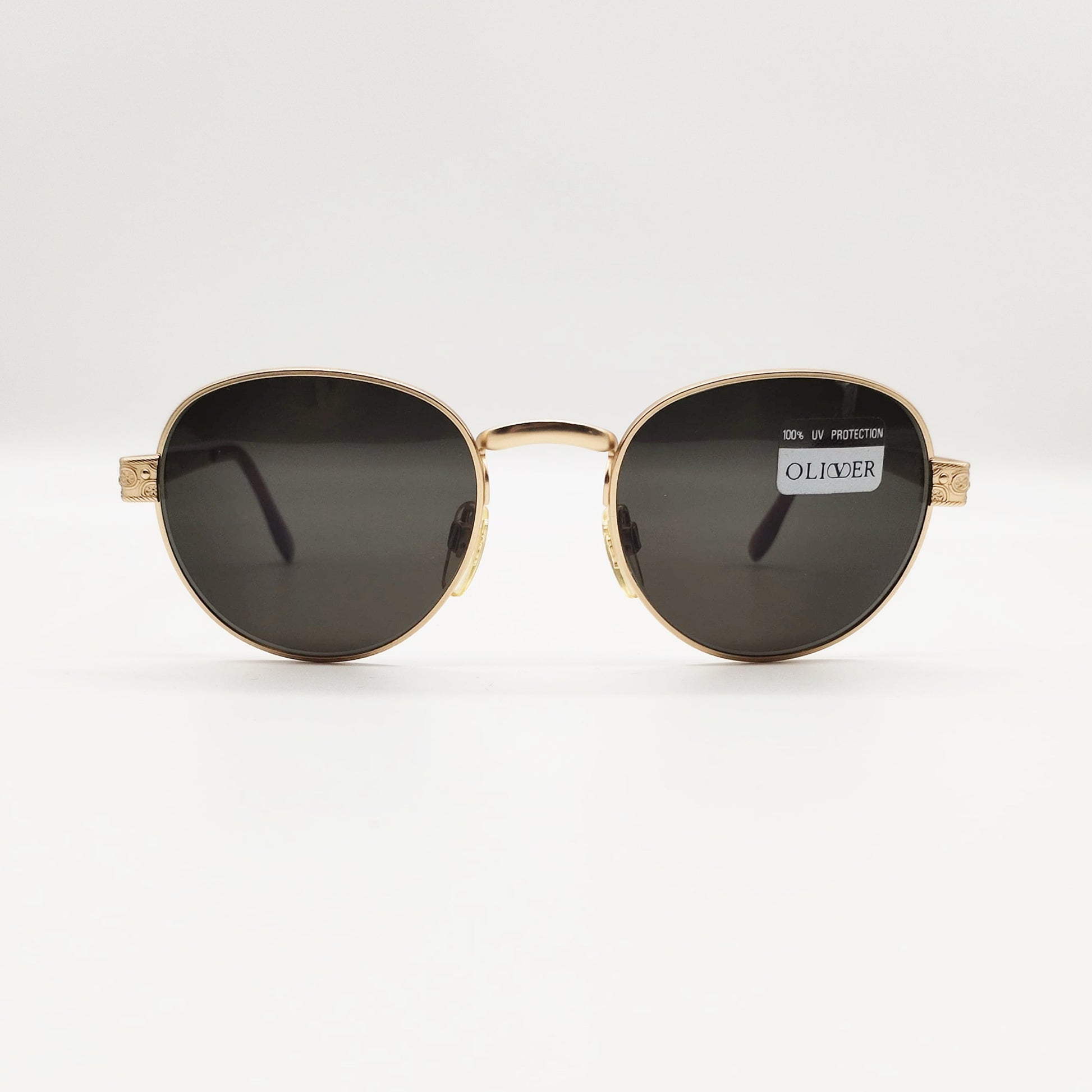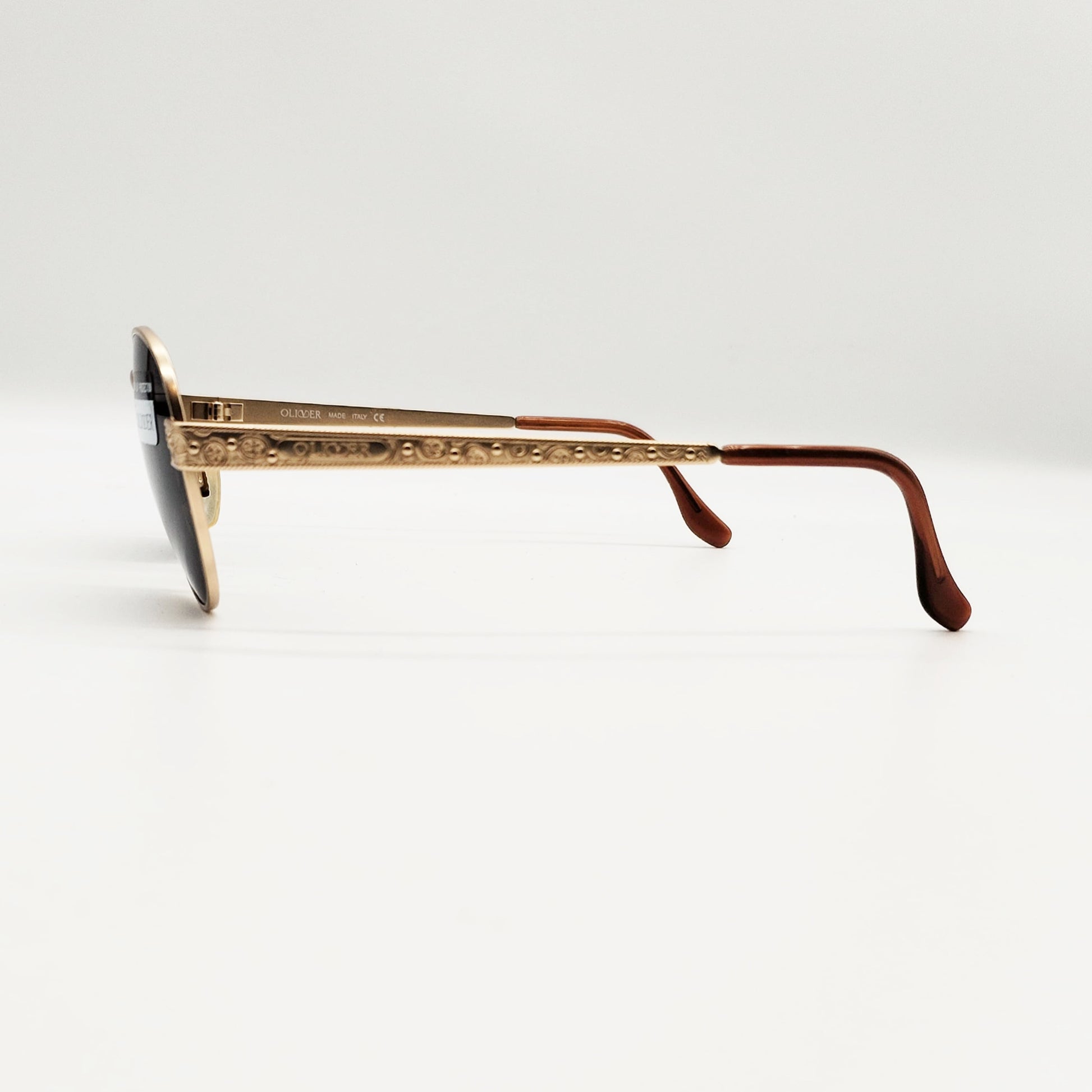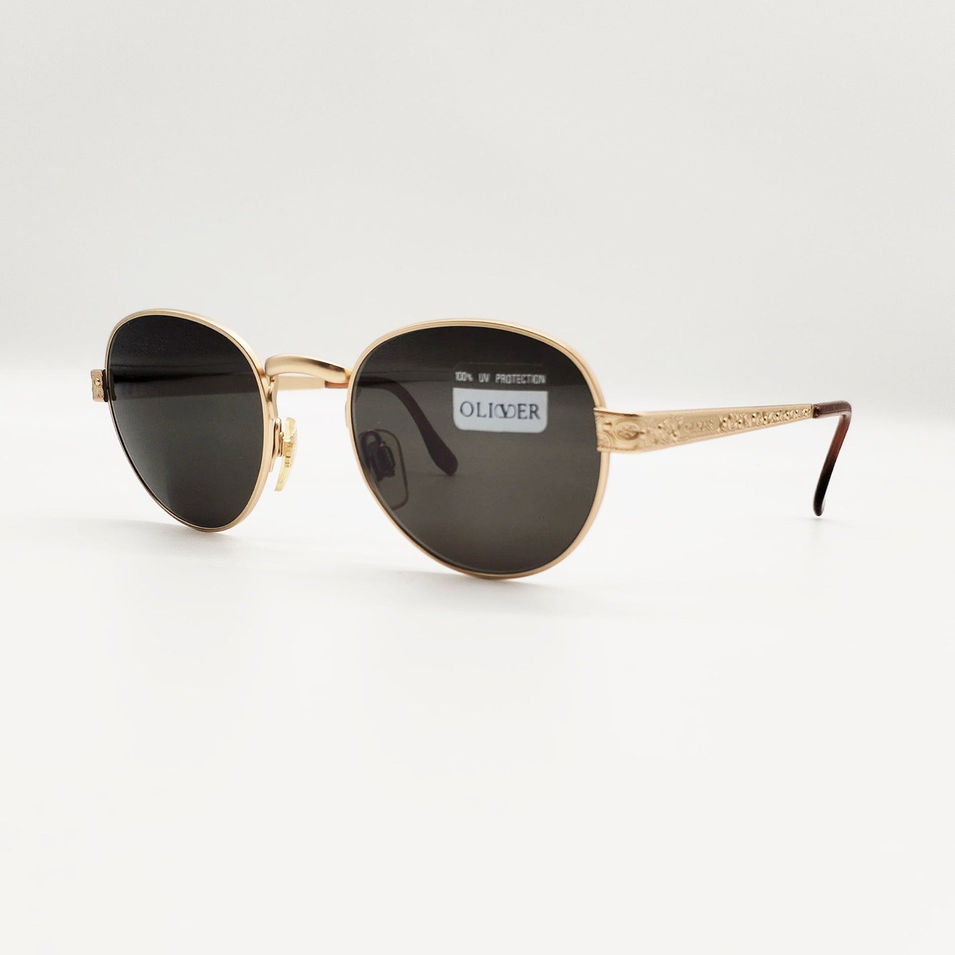 Modello in oro satinato con splendida lavorazione sulle aste e lenti grigie tinta unita. Originale vintage.