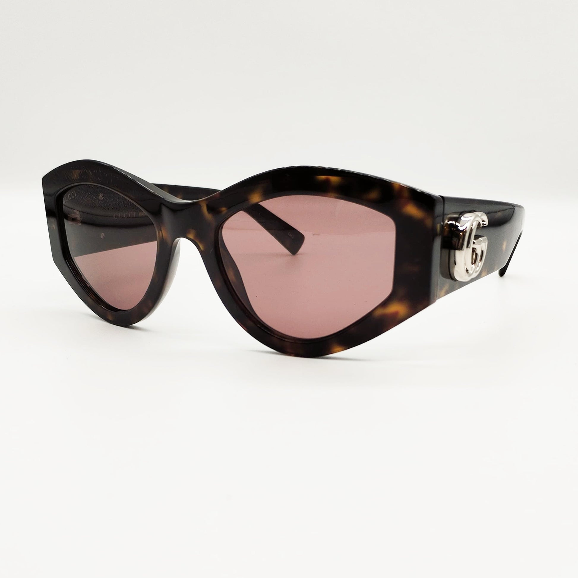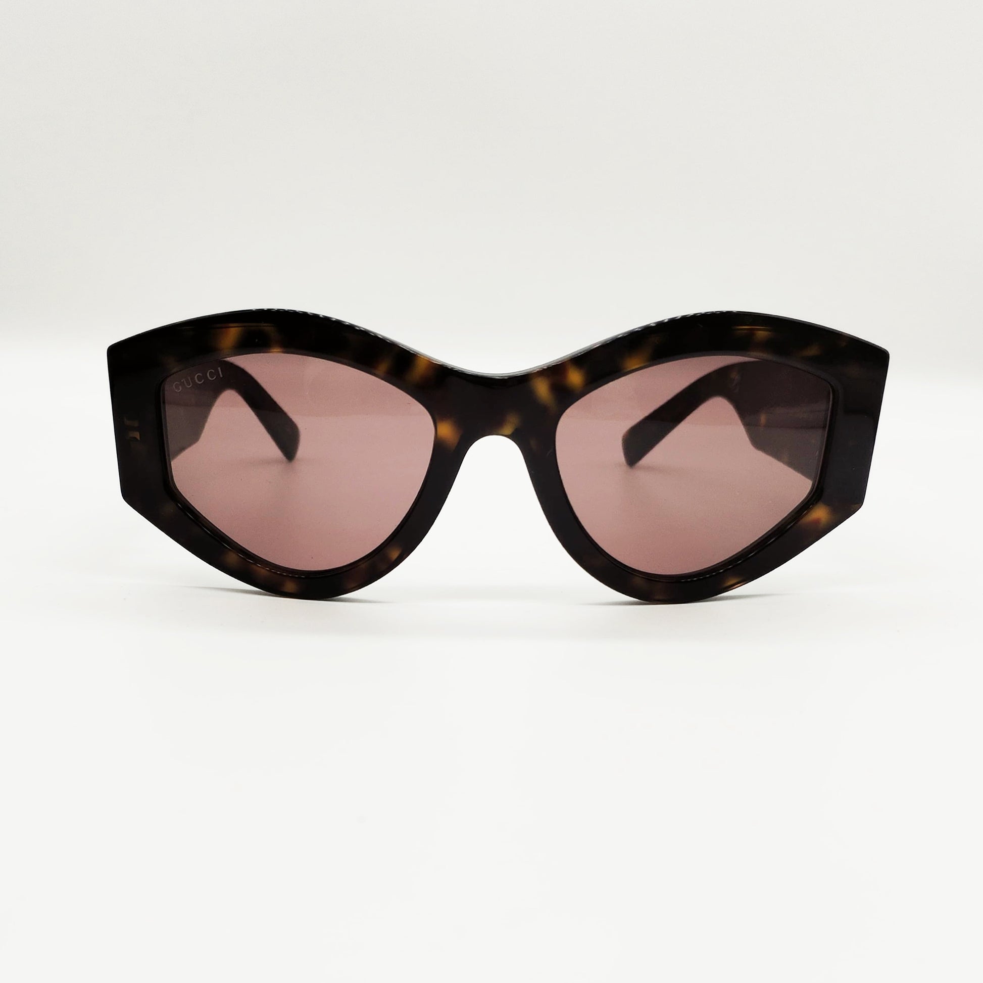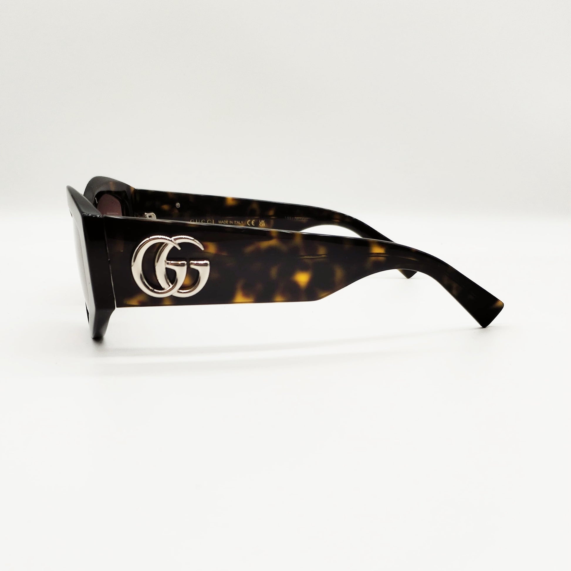 Modello femminile in acetato massiccio avana scuro. Maxi-logo argento sulle aste.