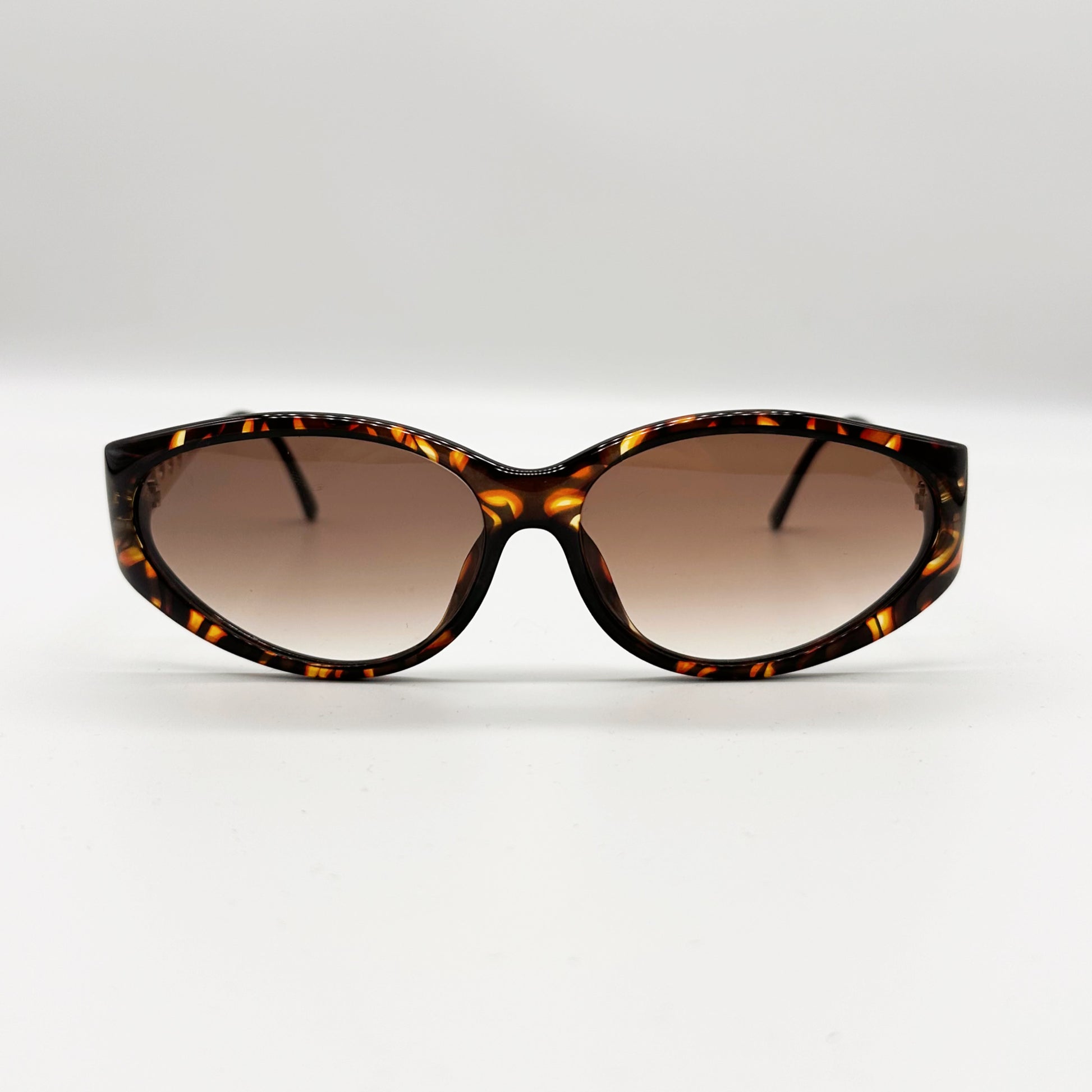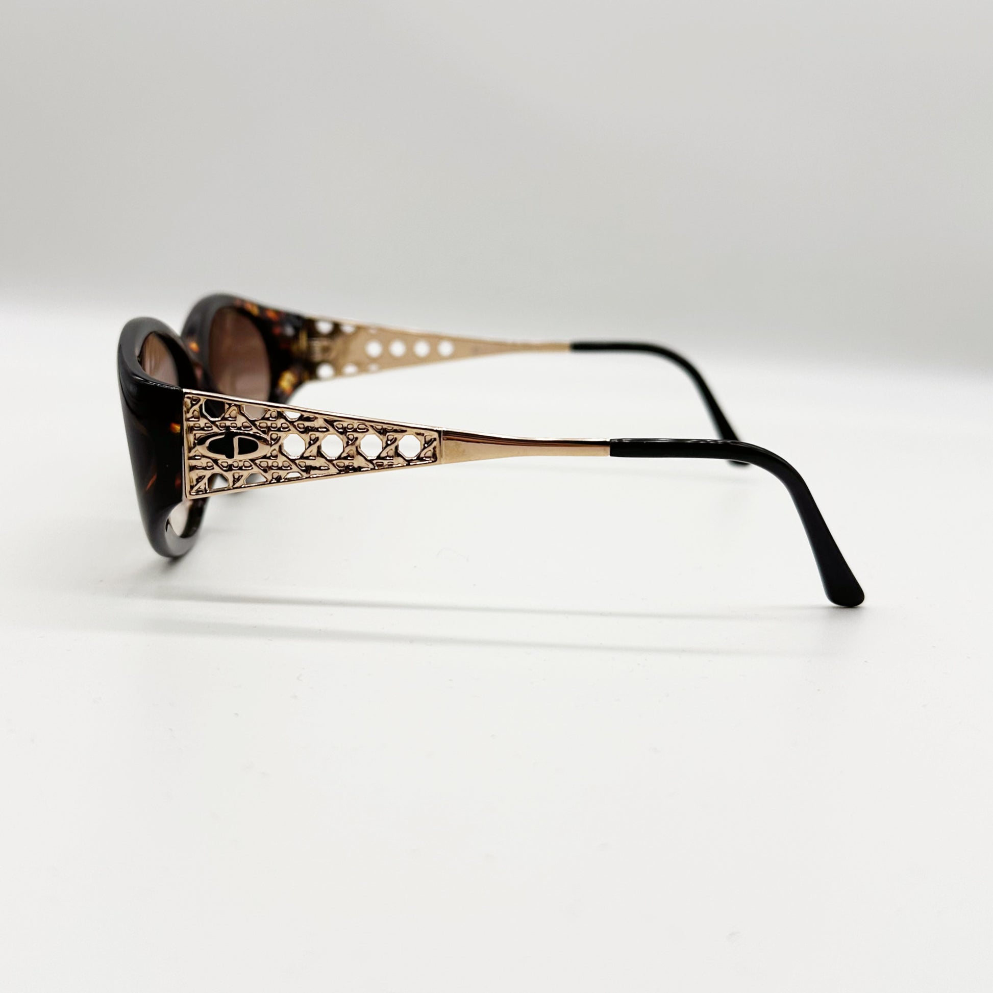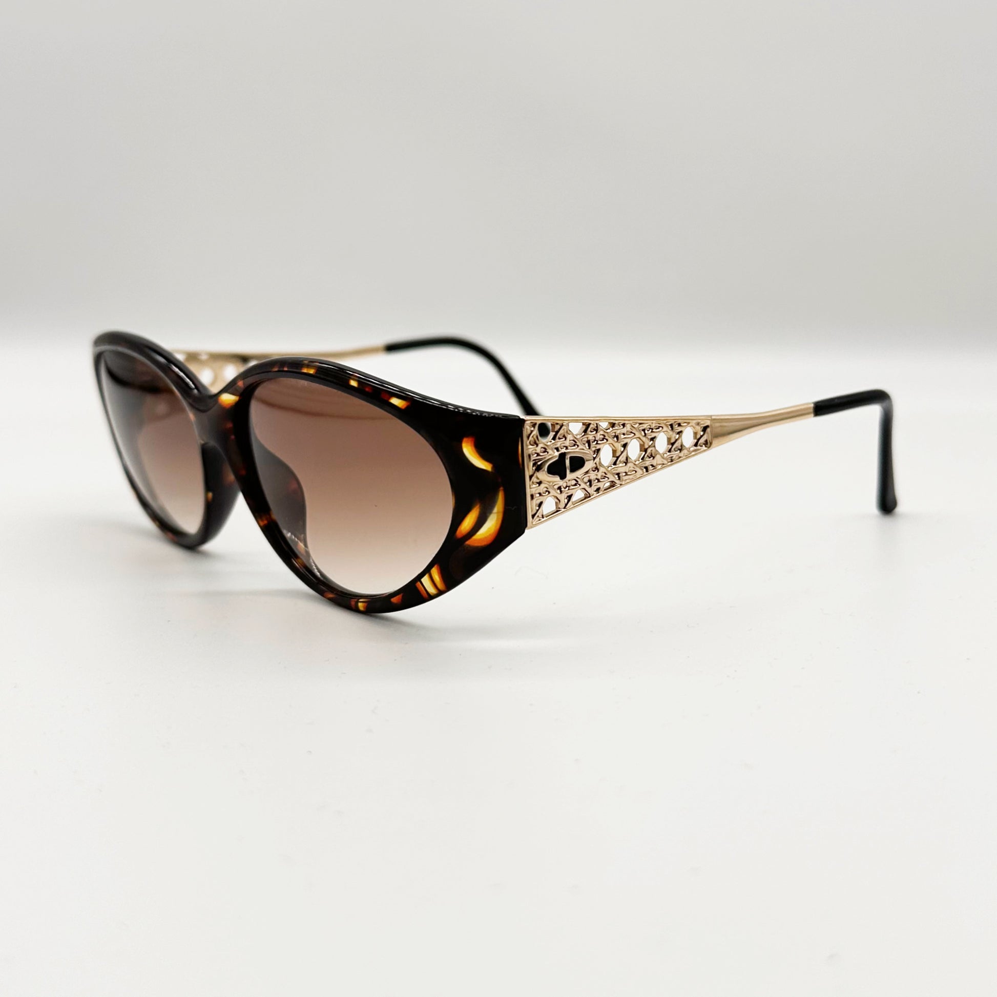 Modello femminile ovale ampio, in splendido materiale avana luminosissimo con aste metalliche oro lavorate.