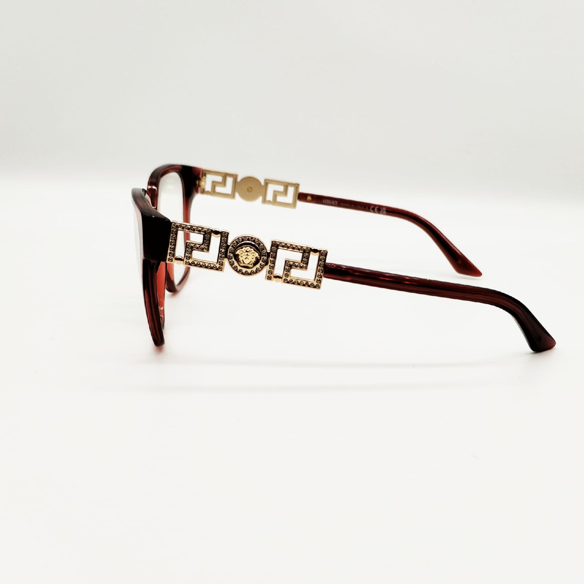 Montatura in acetato femminile con iconica greca sulle aste ricoperta di cristalli luminosi. Caratterizzato da un design dolcemente squadrato e la proporzioni leggermente oversize.