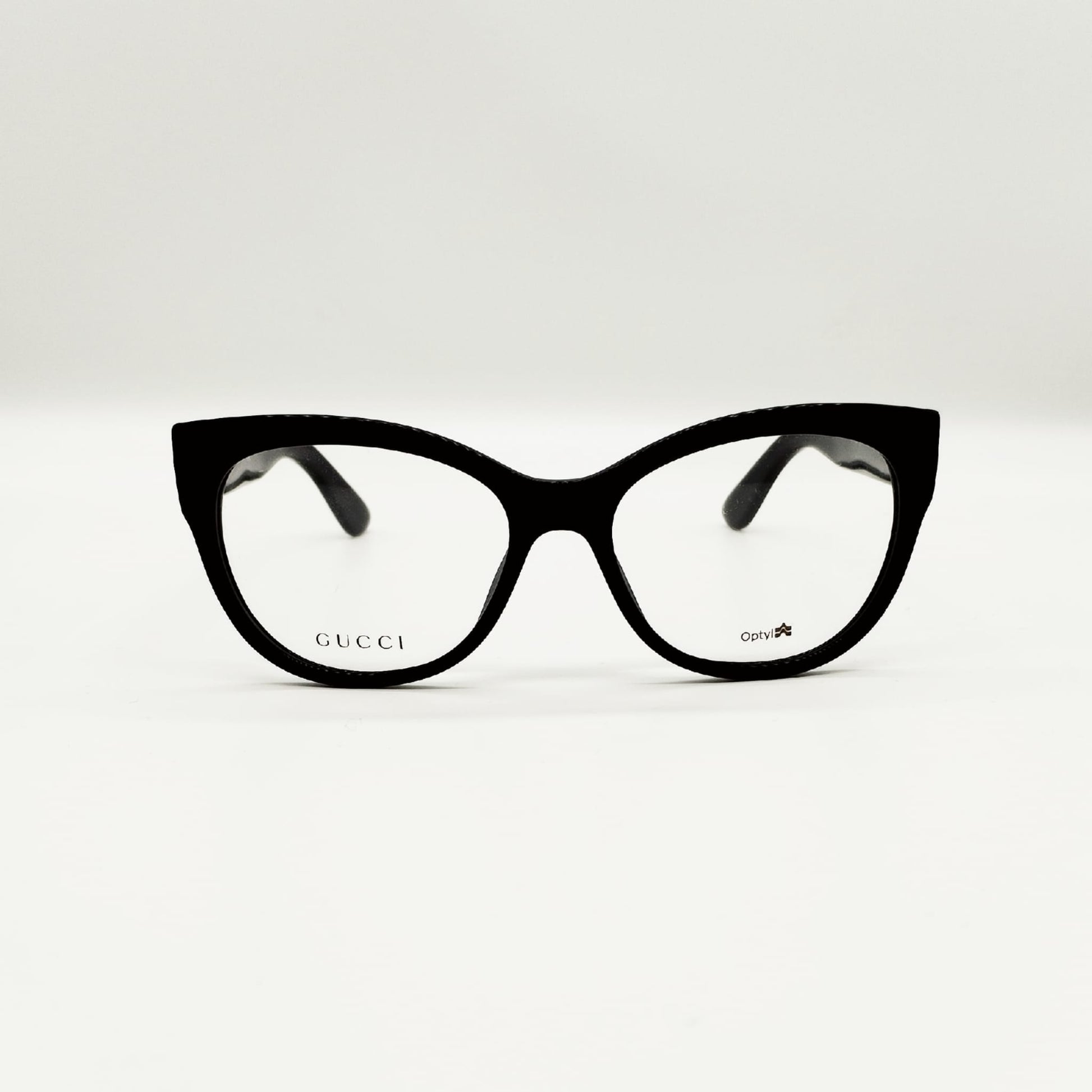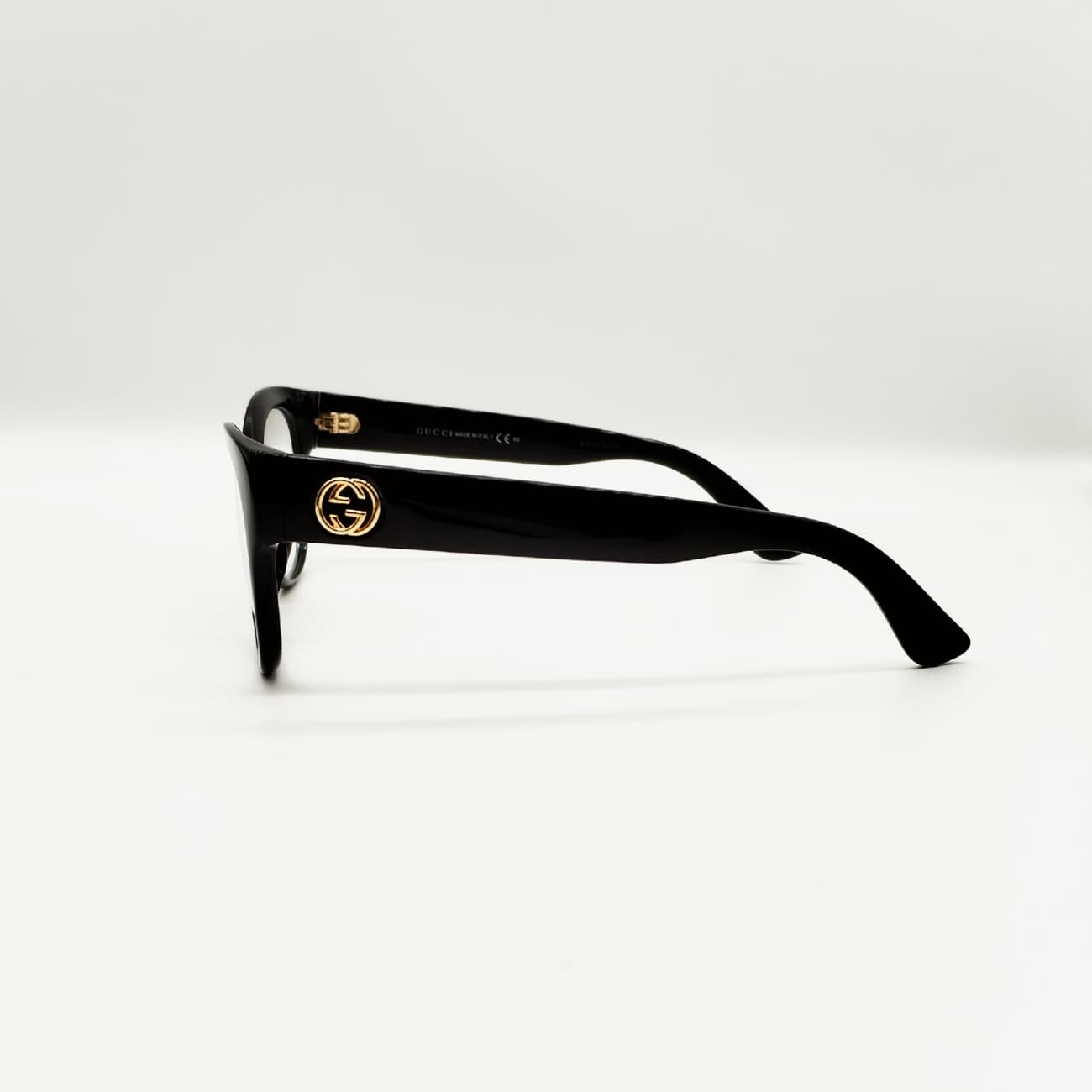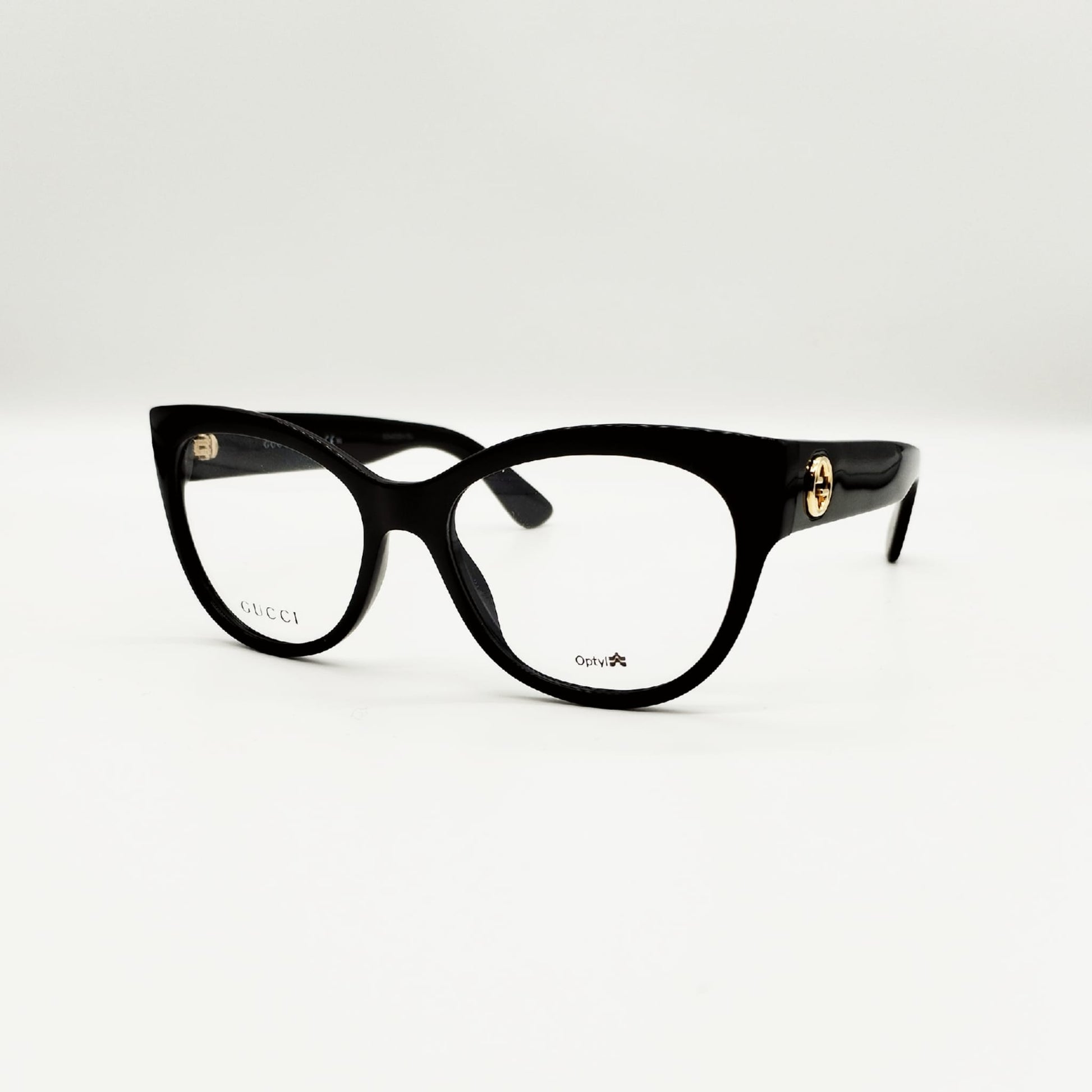 Montatura dalla forma cat-eye in acetato nero lucido con logo Gucci in oro sulle aste.