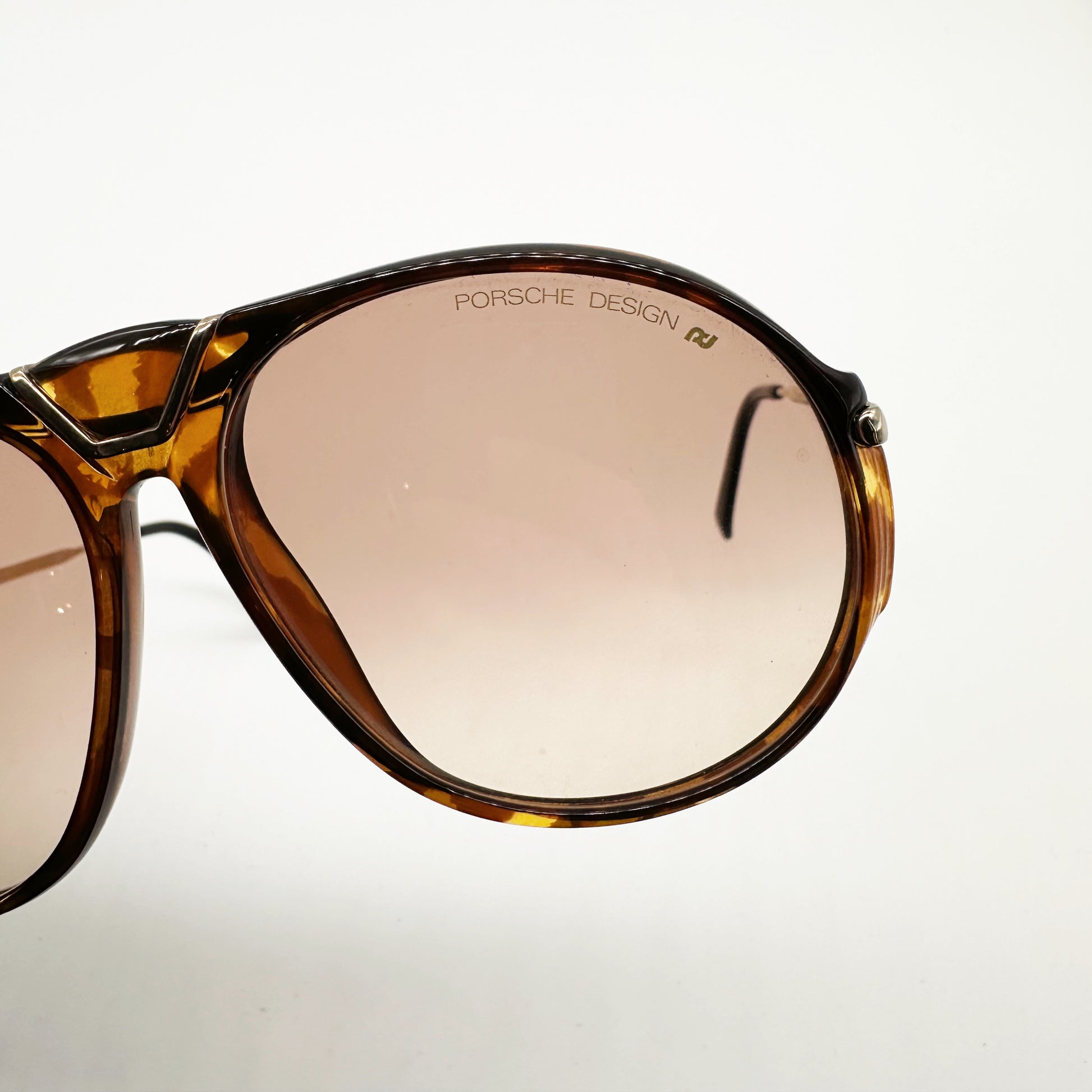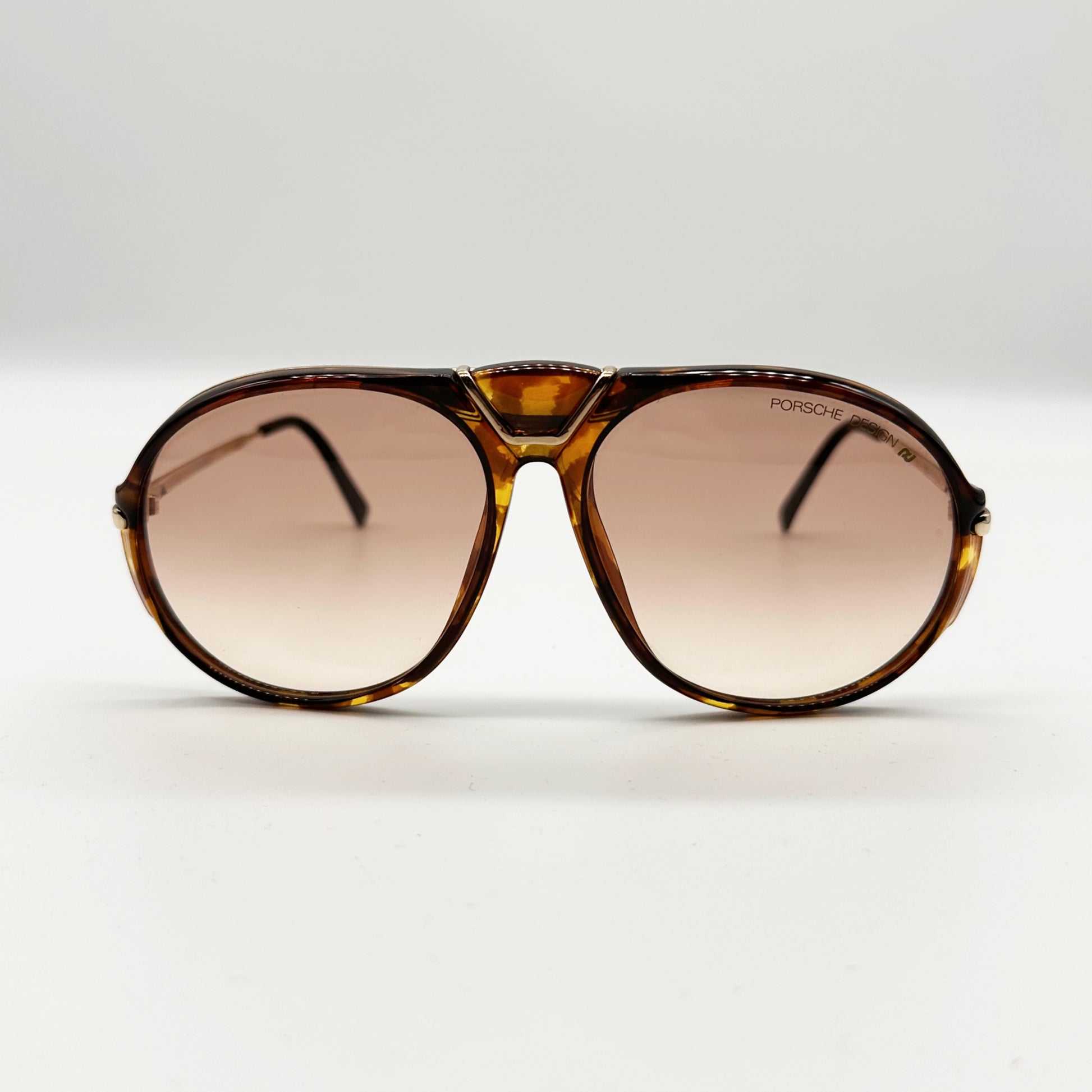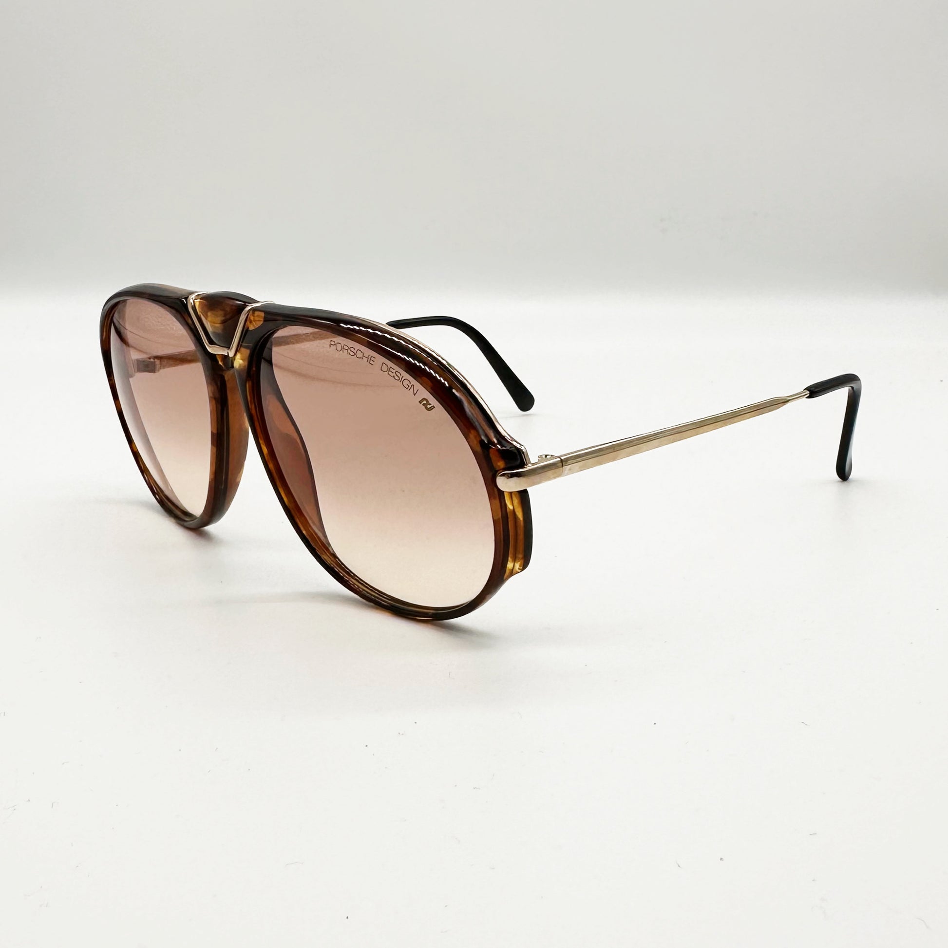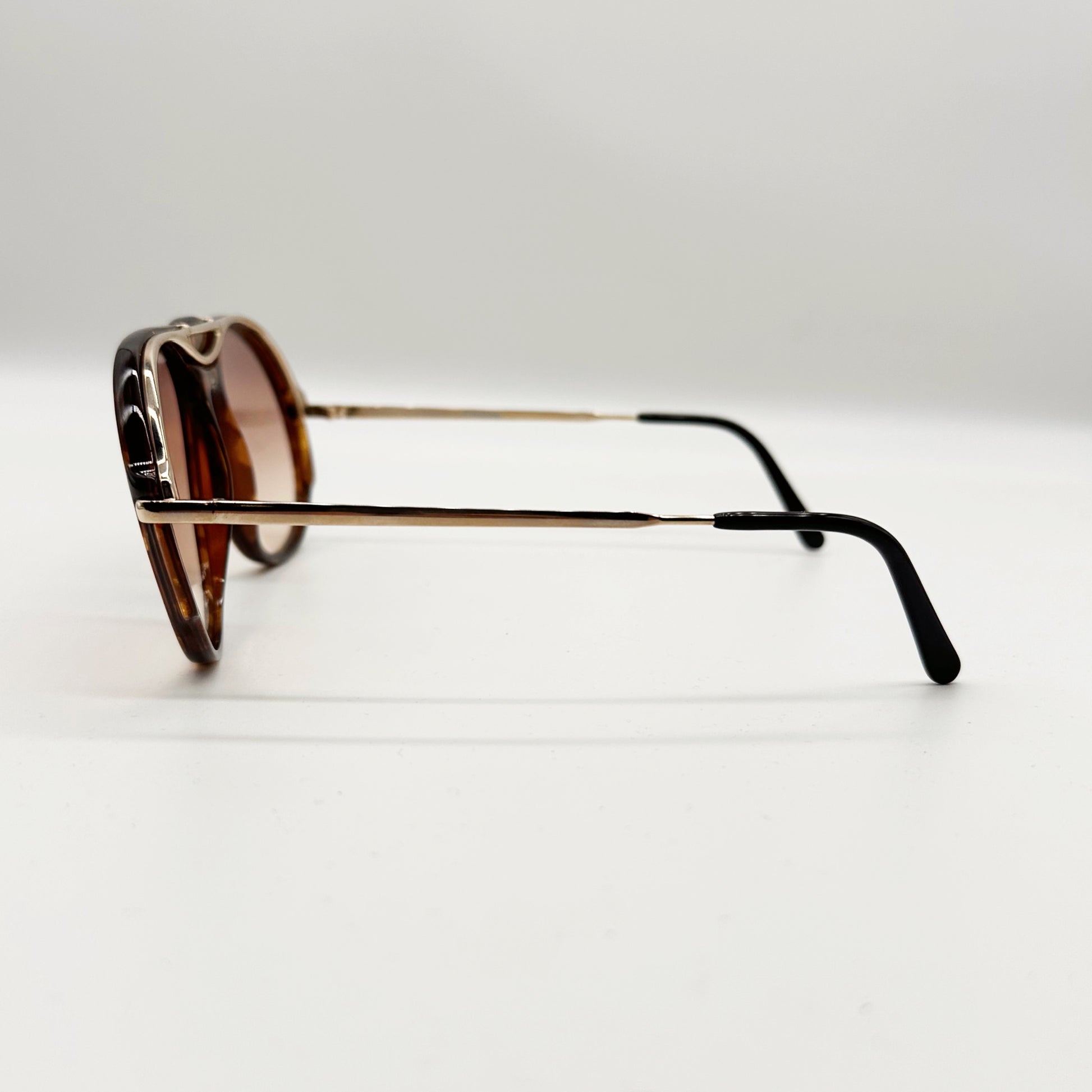 Modello a goccia in materiale avana chiaro con aste e rifiniture oro. Lenti infrangibili sfumate.