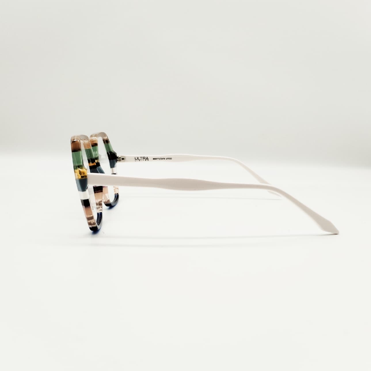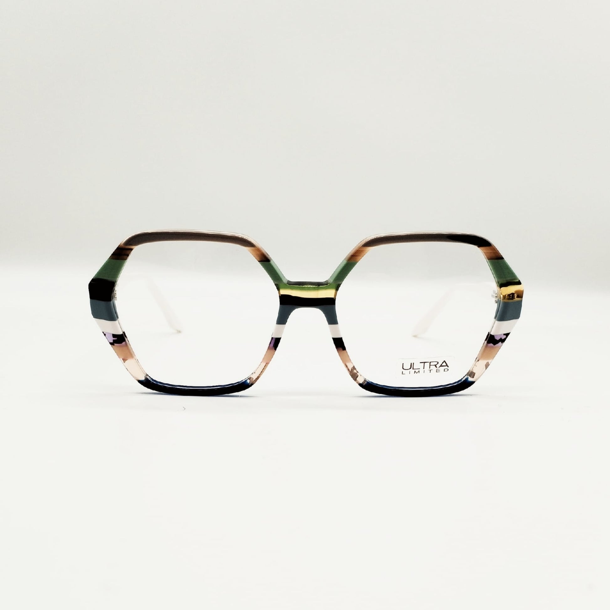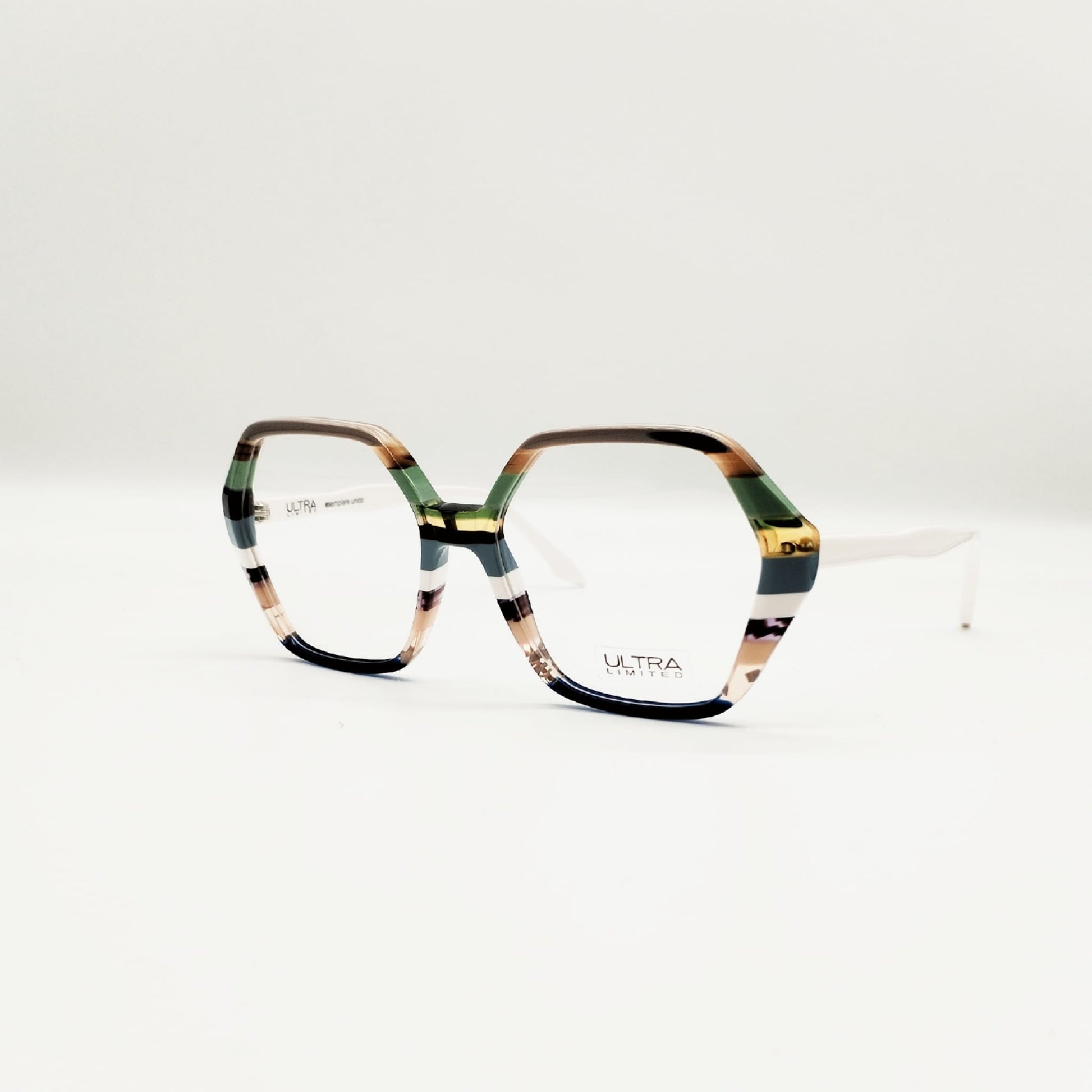 Occhiale da vista donna in acetato con dettagli multicolor sul frontale. La forma sfaccettata dona un tocco giovanile e grintoso. Realizzato a mano in Italia, non si troverà mai un occhiale identico: ogni Ultralimited è frutto dell'associazione random di 8-12 lastre di colorazioni differenti modificate ogni sei mesi, che lo rende unico.