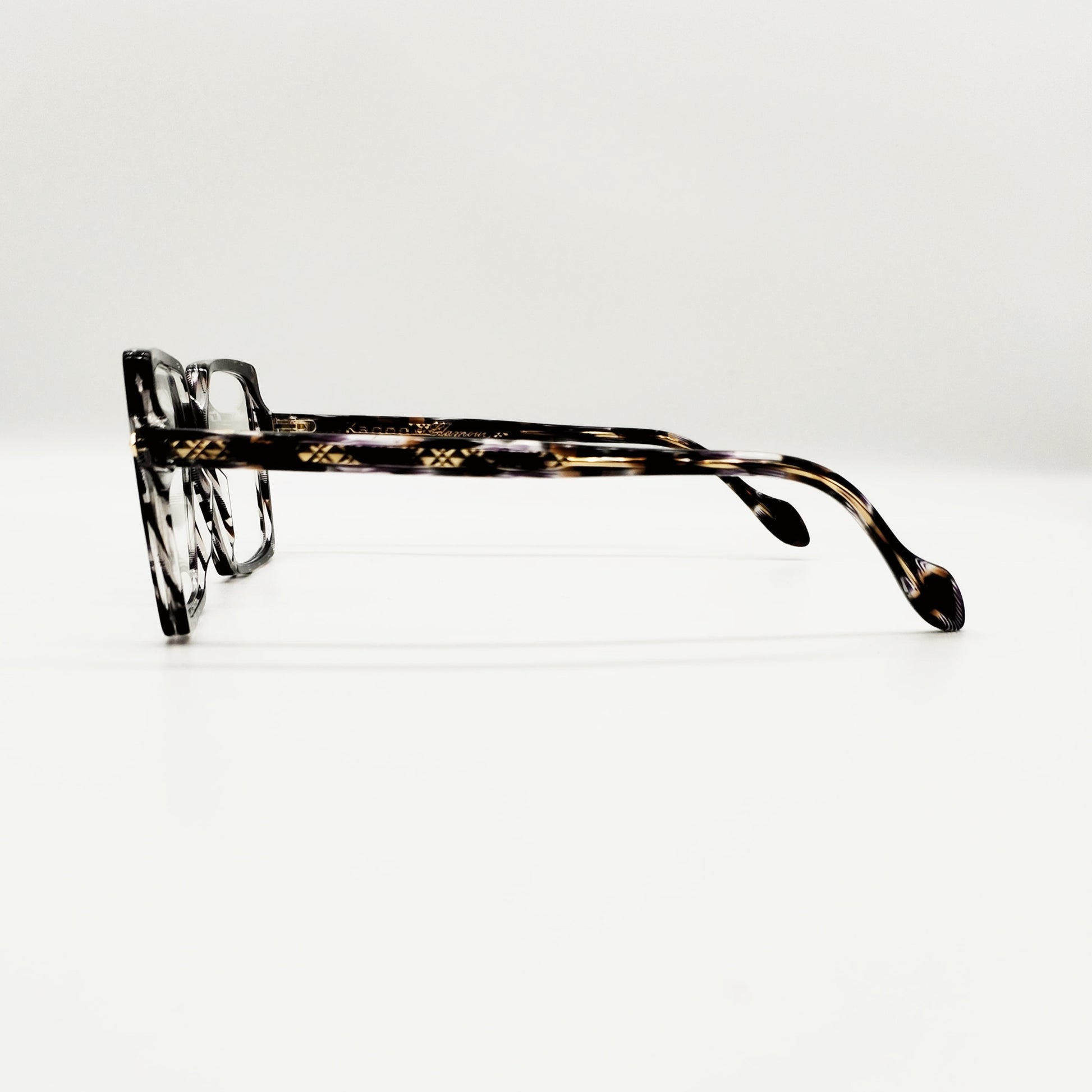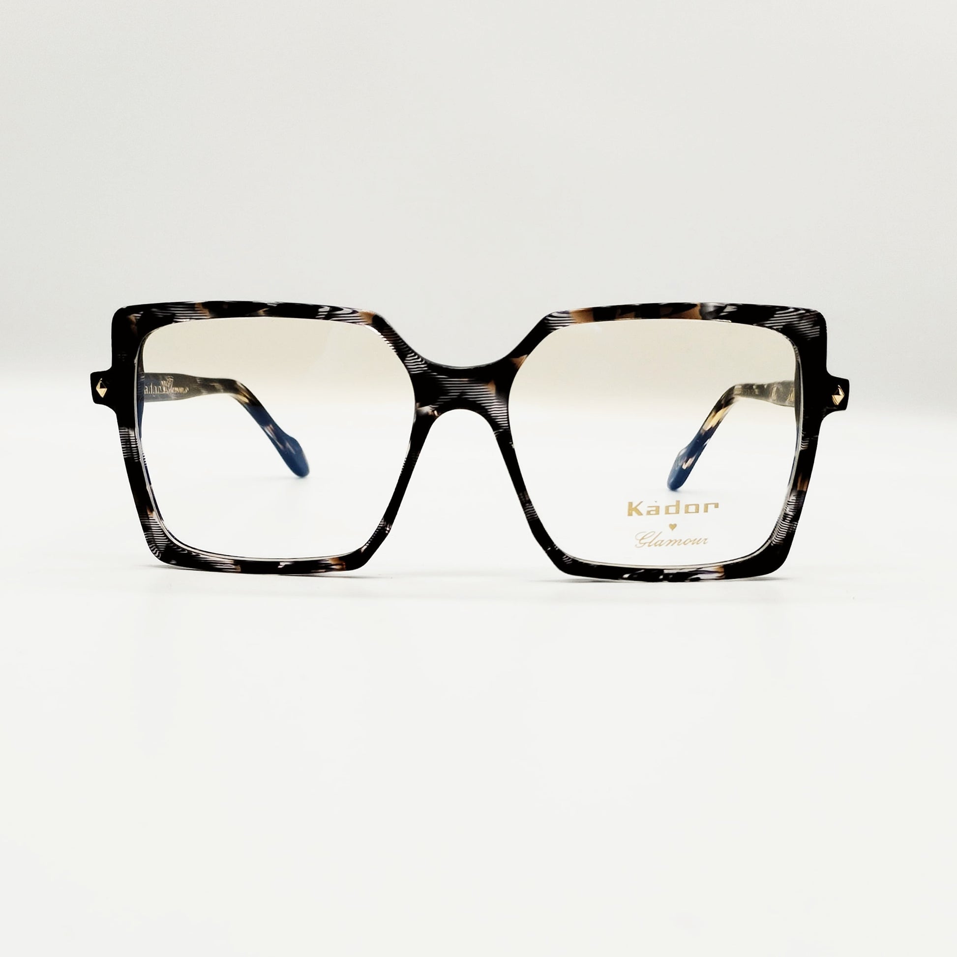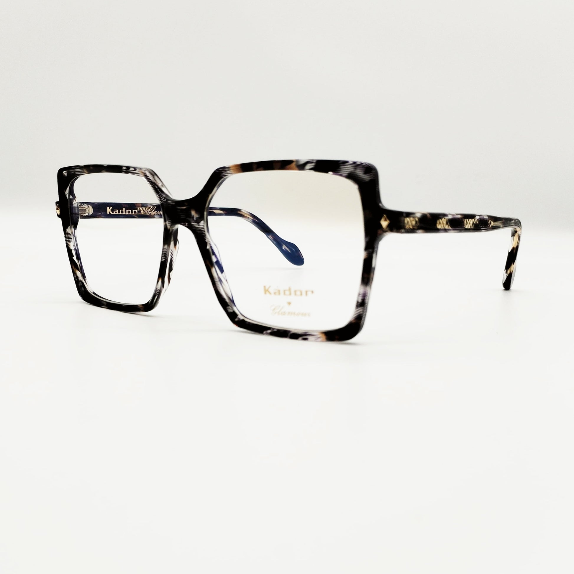 Modello femminile squadrato di splendida lastra lucidissima per un effetto super luminoso. Delle aste è visibile l’anima in metallo oro lavorata. Occhiali 100% Made in Italy.