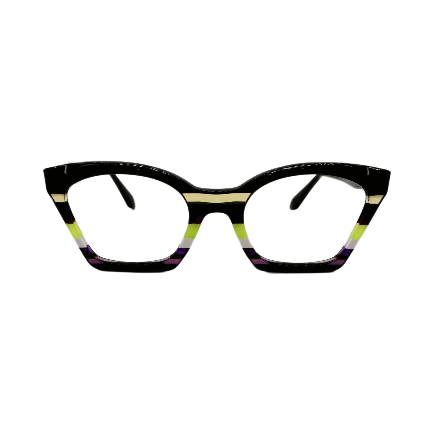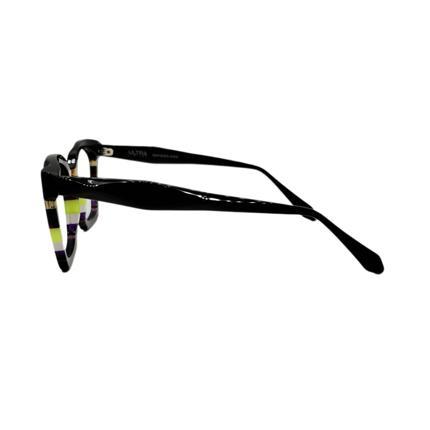 Occhiale da donna in acetato. La forma slanciata e femminile. Realizzato a mano in Italia, non si troverà mai un occhiale identico: ogni Ultralimited è frutto dell'associazione di 8-12 lastre di colorazioni differenti rinnovate ogni sei mesi, che lo rende unico.