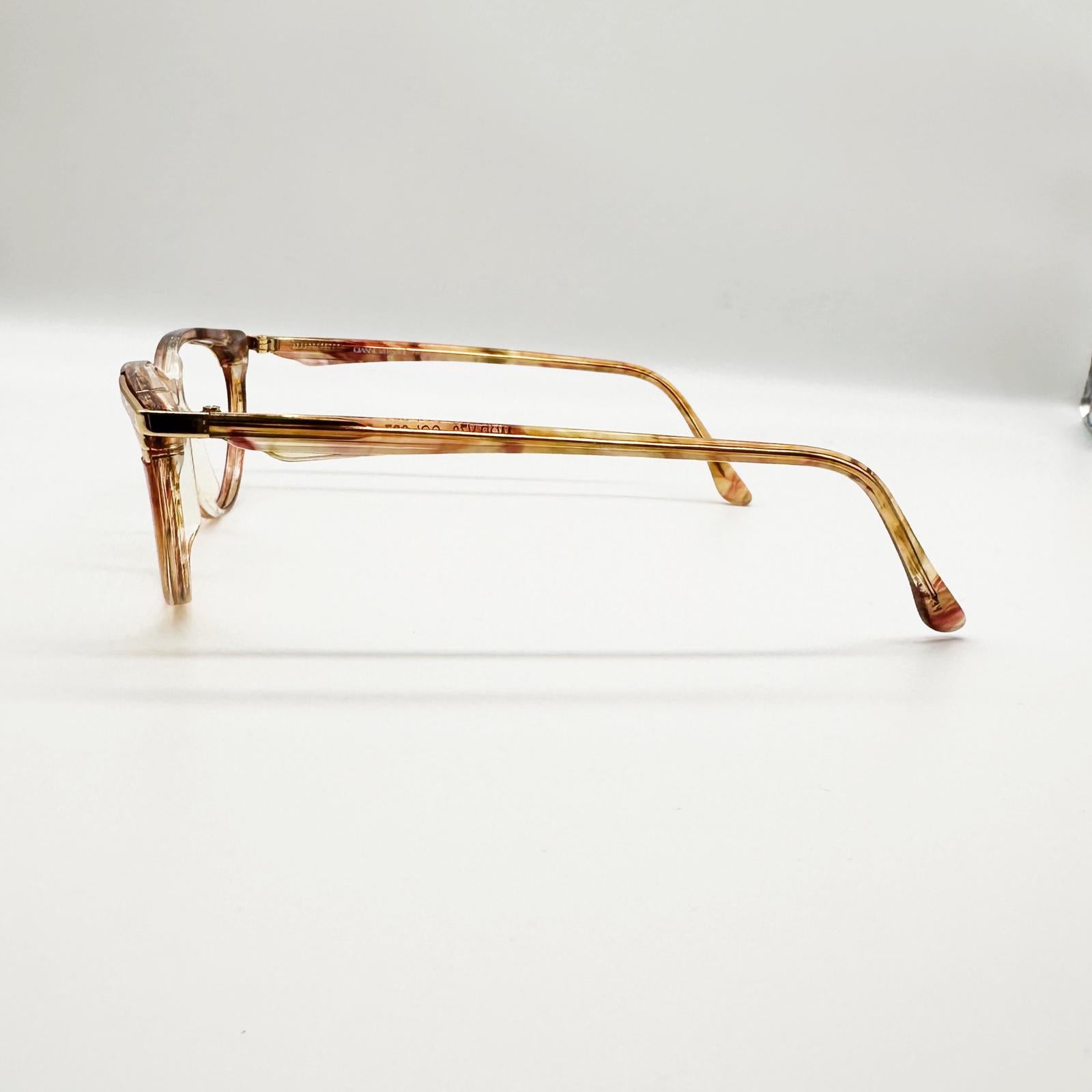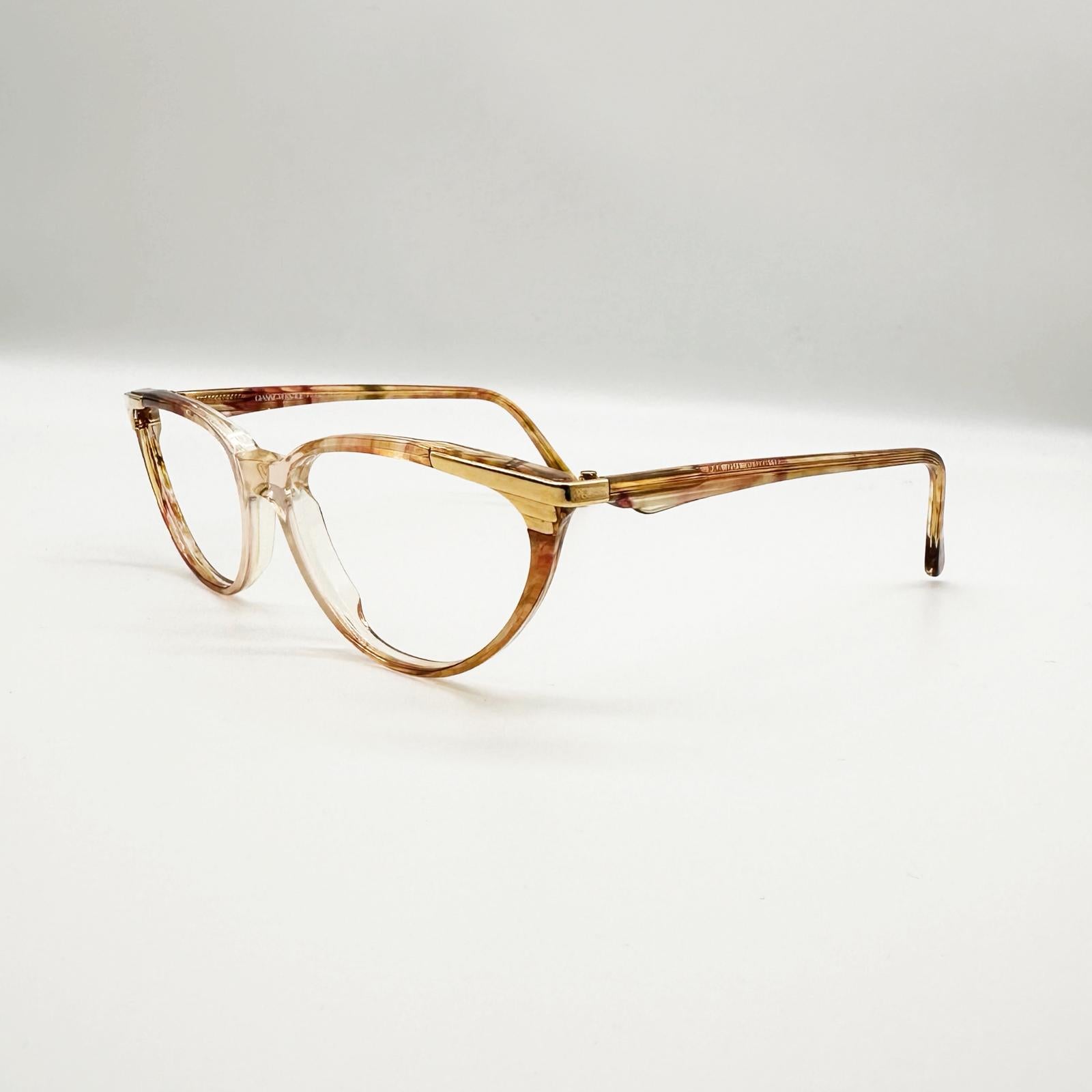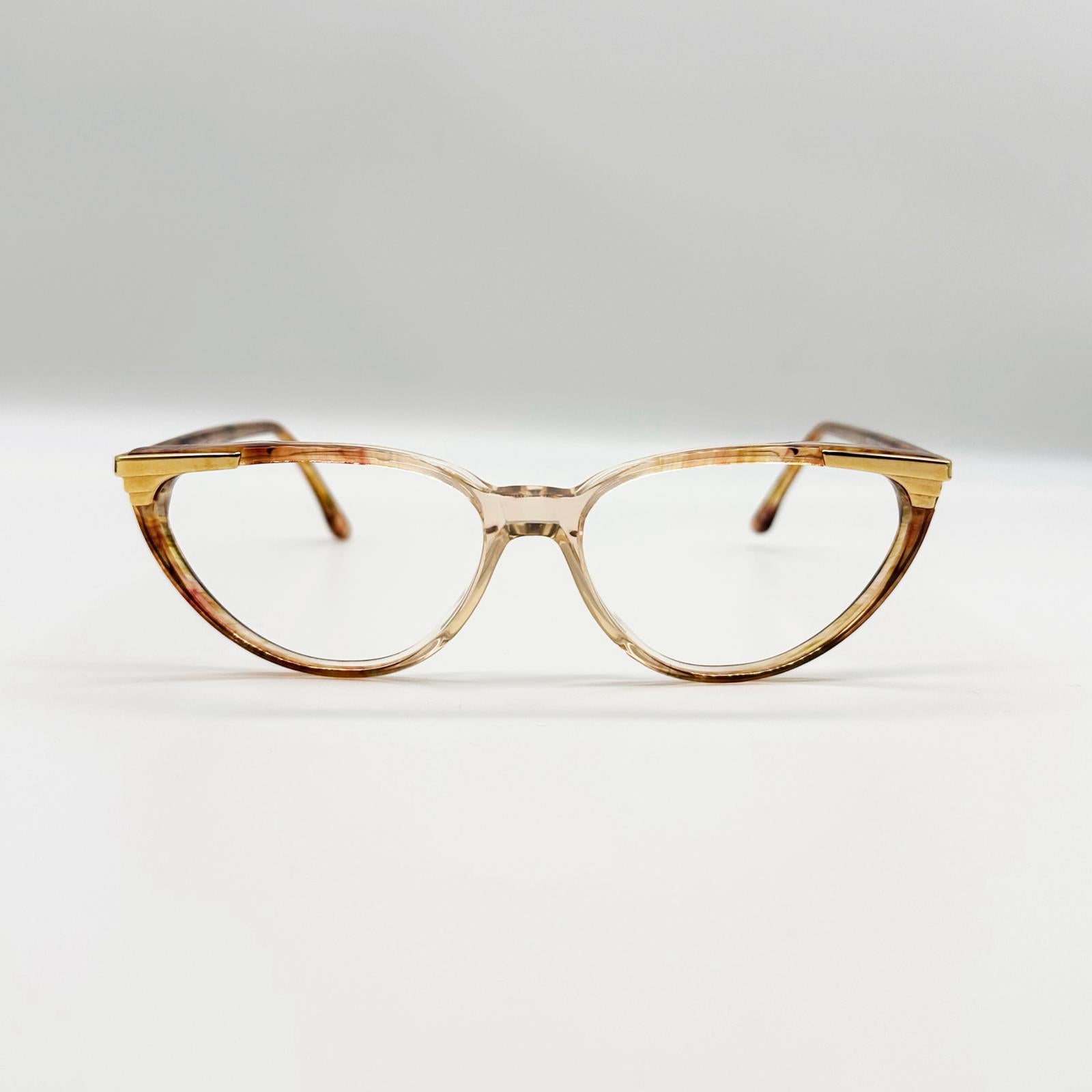 Modello femminile forma cat-eye in acetato con punte in metallo oro. Colore havana chiaro che sfuma in trasparenza.