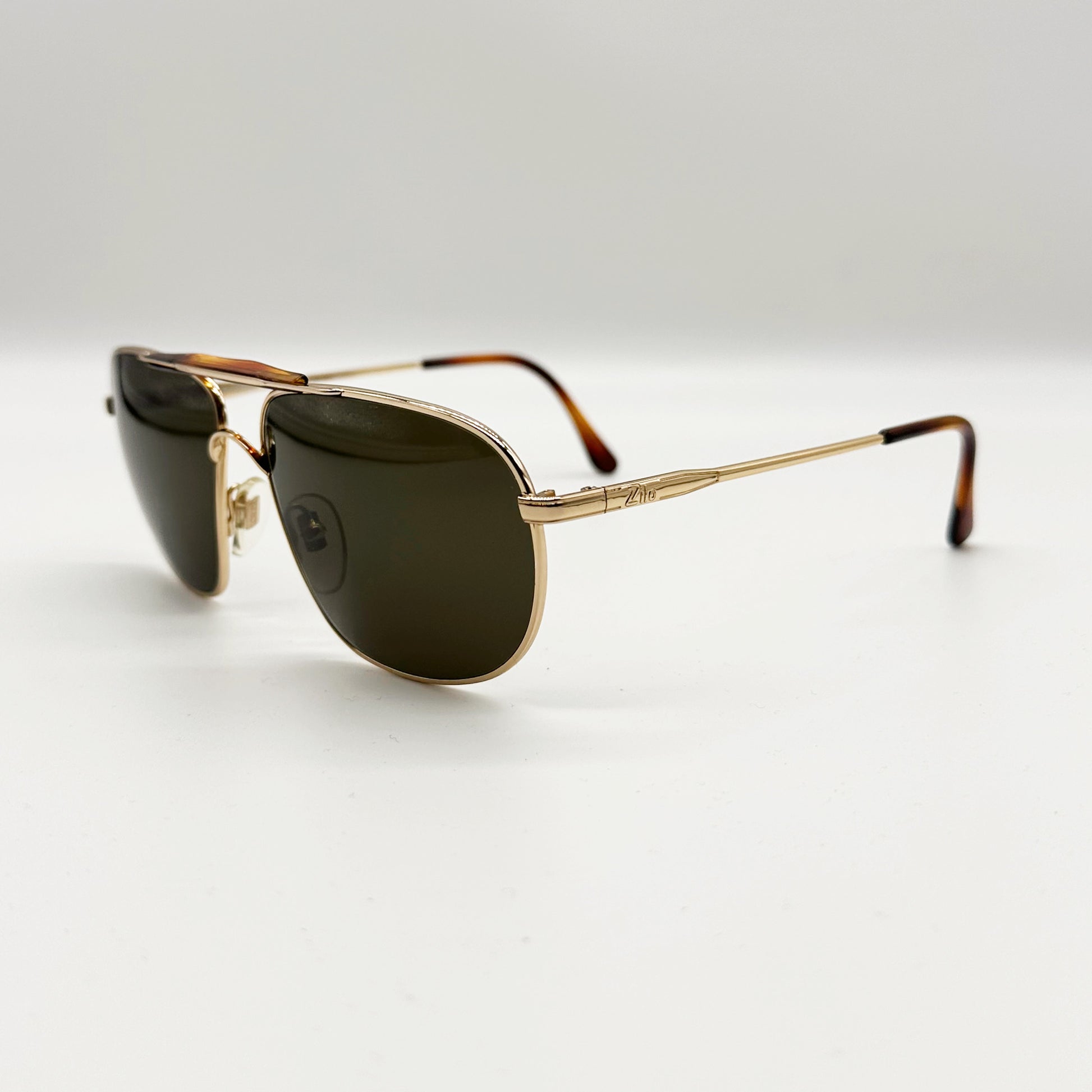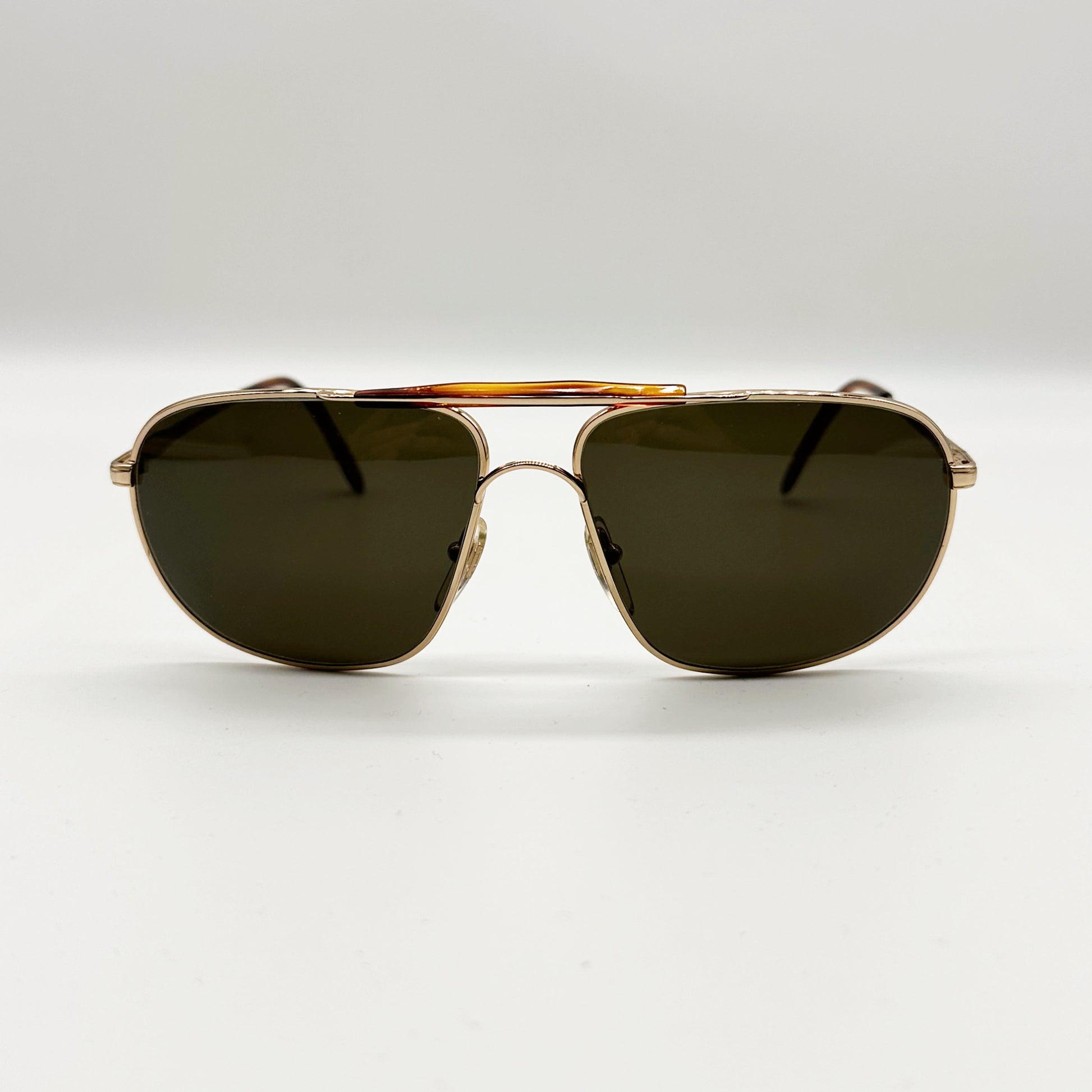 Modello in metallo a doppio ponte con rifiniture avana e lenti infrangibili tinta unita.